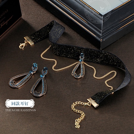 这款Special项链采用的是当下最流行的Choker款式,项链有两层,一层为亲肤透气的金丝丝绢带,一层为精致纤细的合金链,戴在脖子上很有复古感。项链吊坠为深蓝色水滴形状,上面镶嵌着耀眼璀璨的水钻,仿佛漆黑夜空中明亮的星星。还有同款的耳环可以搭配哦,一套戴起来更显大方优雅。